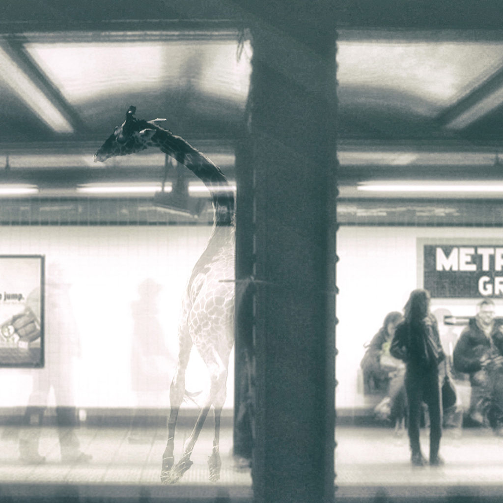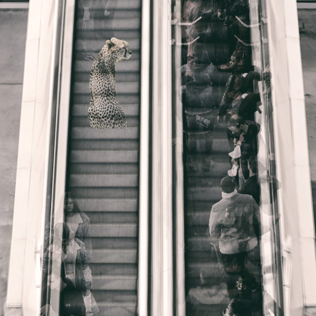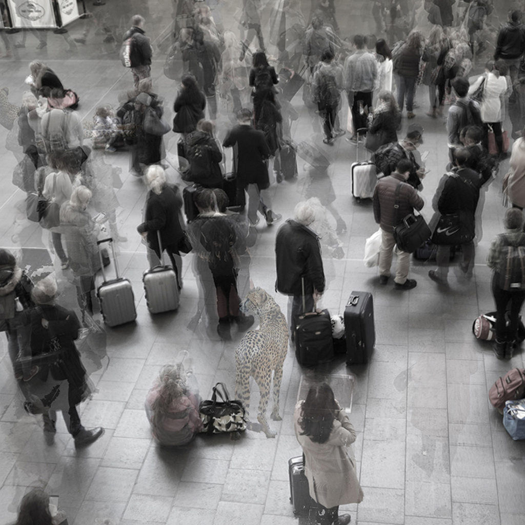 I am trying to reflect my personal vision about society today through each image of this project. A society of zombies who live in an automatic state. A group of people who don’t know what is happening around them, who are always distracted by their mobile screens and isolated by oversized headphones. They don’t realise that there are wild animals walking near us.
