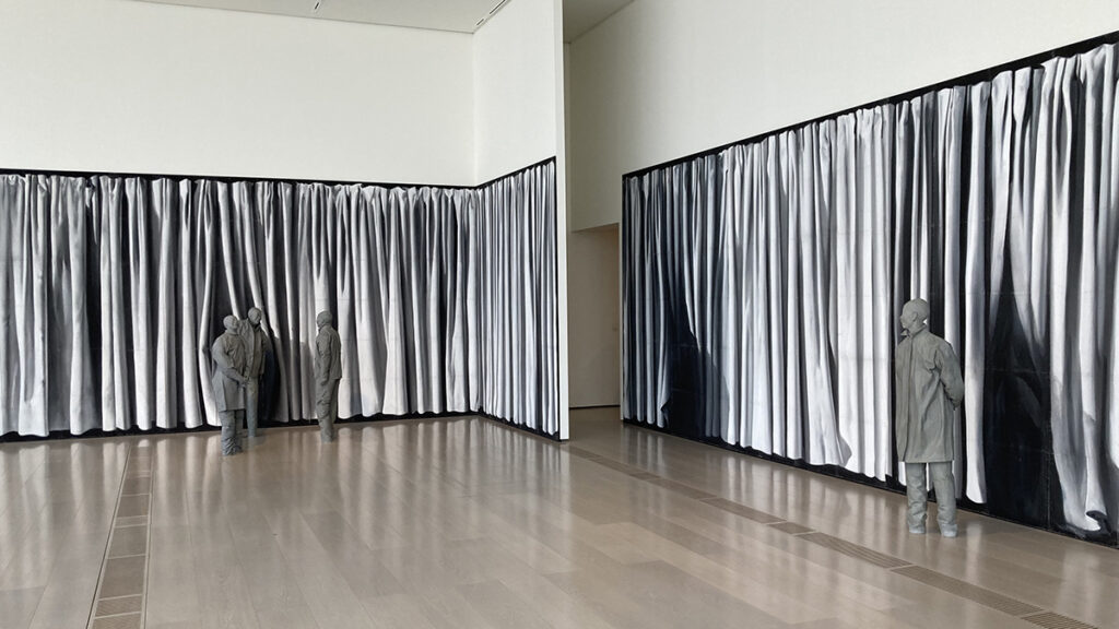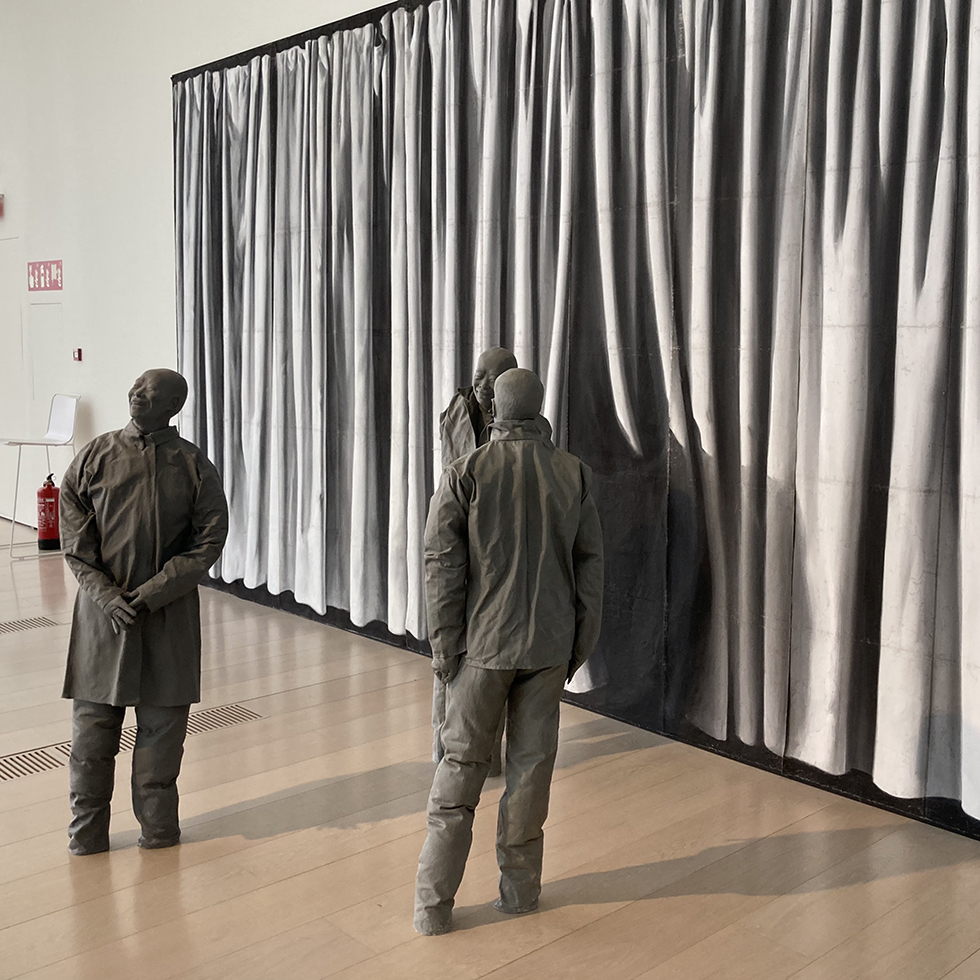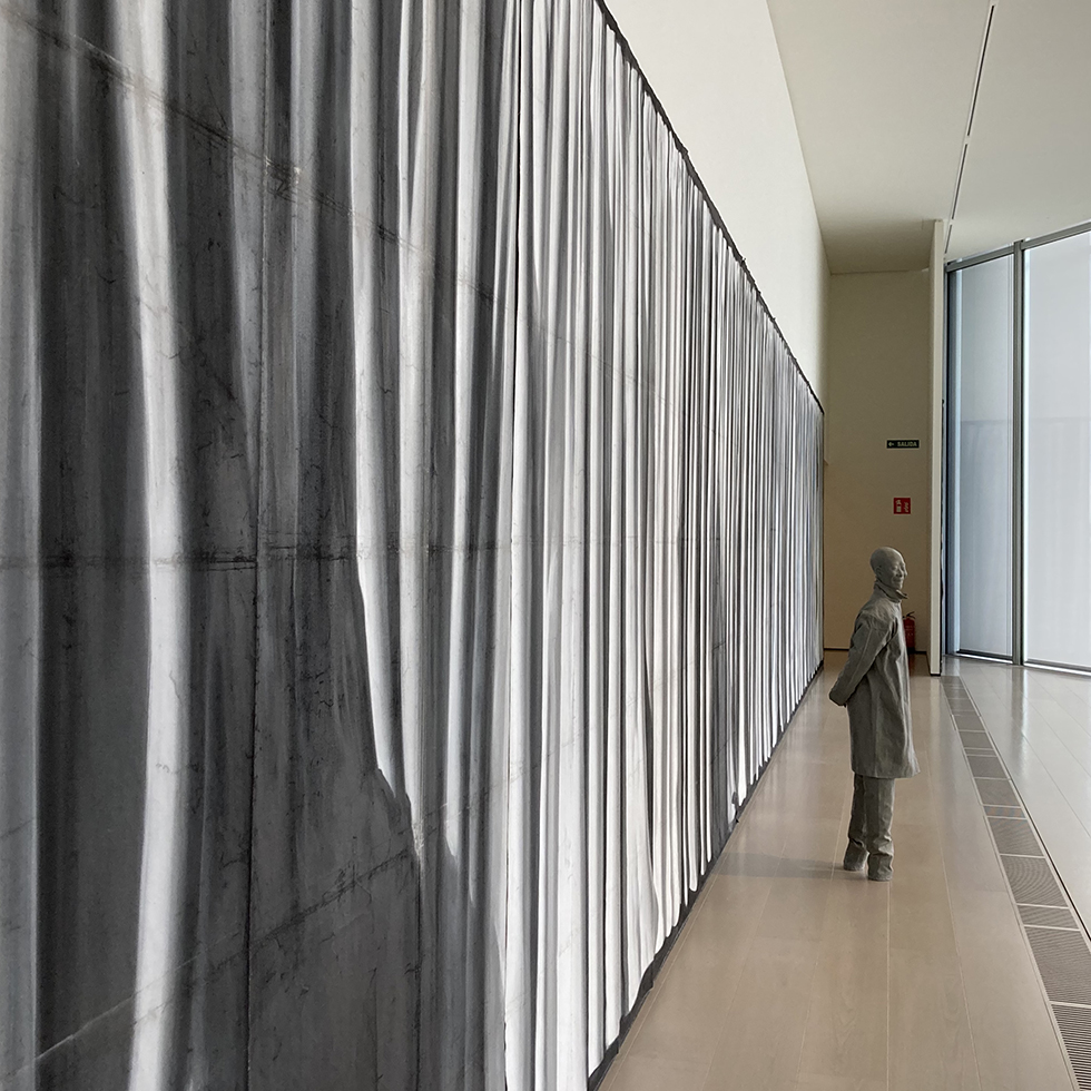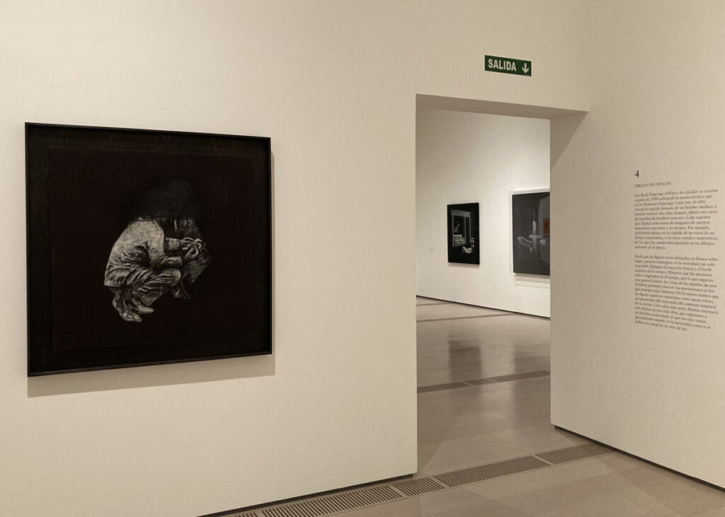 Nous continuons à contempler quelques dessins d’anatomie masculine une autre fois sur toile-tissu noir avec crayon blanc. Après nous arrivons à la salle principale du Musée avec vue sur la baie où nous pouvons admirer une magnifique installation avec ses iconiques sculptures masculines.