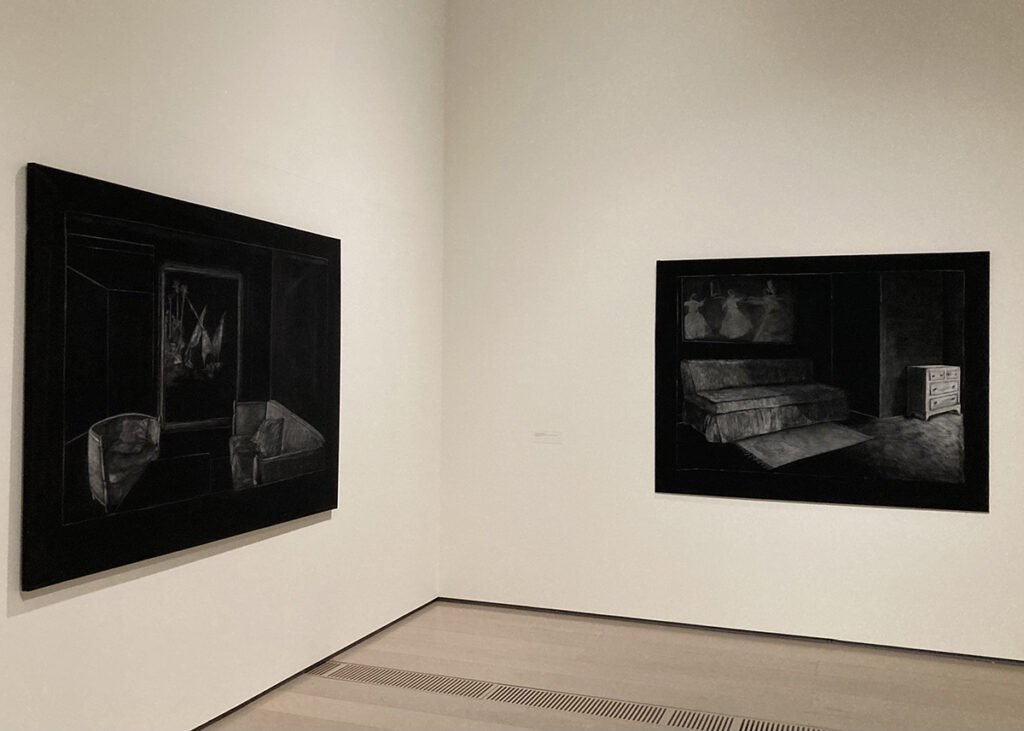 A continuación descubrimos unos maravillosos dibujos en blanco sobre tela de gabardina teñida de negro. Son dibujos de interiores y el contraste con la sala que acabamos de dejar me hace volver continuamente atrás para