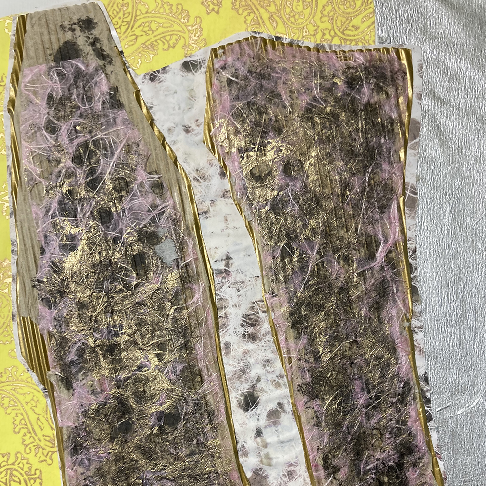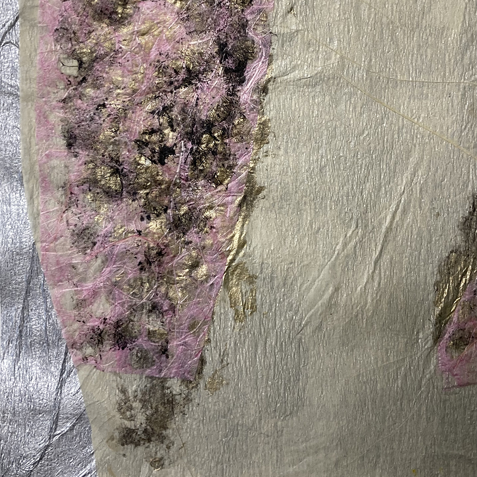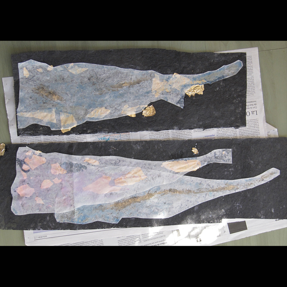 Me sentí inspirada por la técnica japonesa Gyotaku, pero la adapté a mi propio estilo. Pedí pieles de pescado a los pescaderos, las cubrí con varias tintas chinas y trabajé con presión para transferirlas a diferentes papeles. Luego jugué con papeles, tinta e intuición. Cuando pinto, mi intuición es muy importante; creo que mi subconsciente se expresa a través de lápices, papeles, etc. Me gusta pasar tiempo pintando, viendo, esperando y escuchando lo que la pintura me está diciendo. Creo que solo sigo las instrucciones del papel.