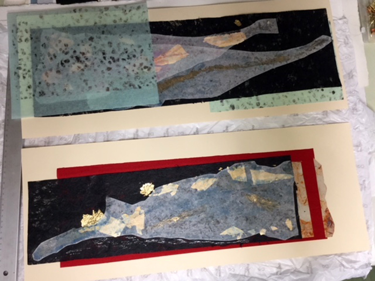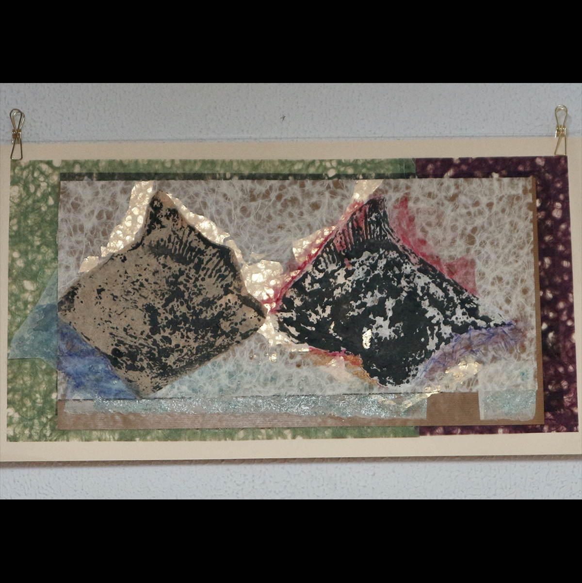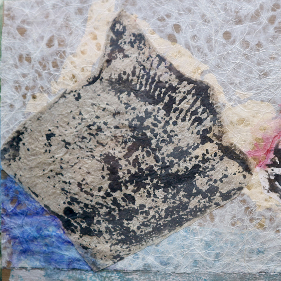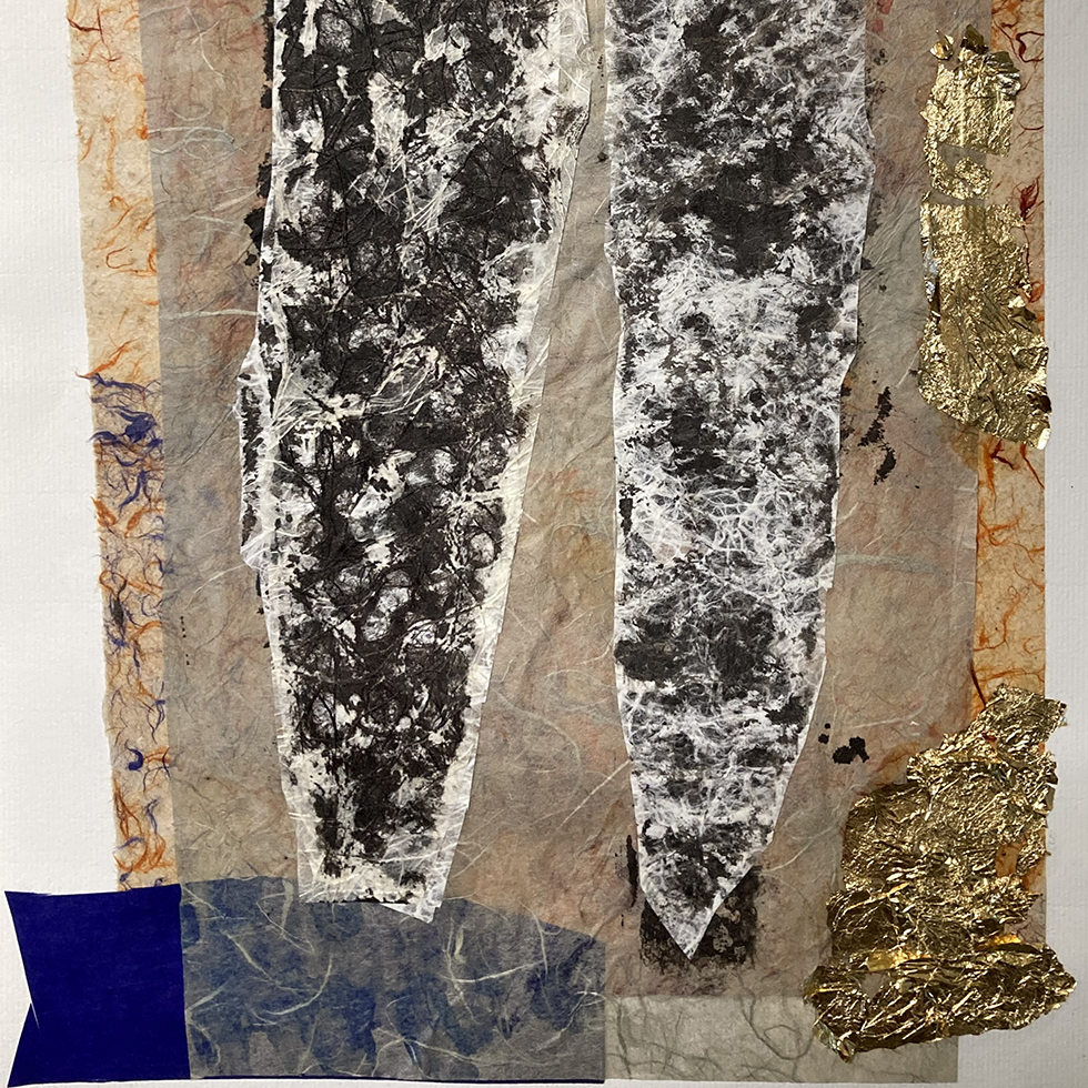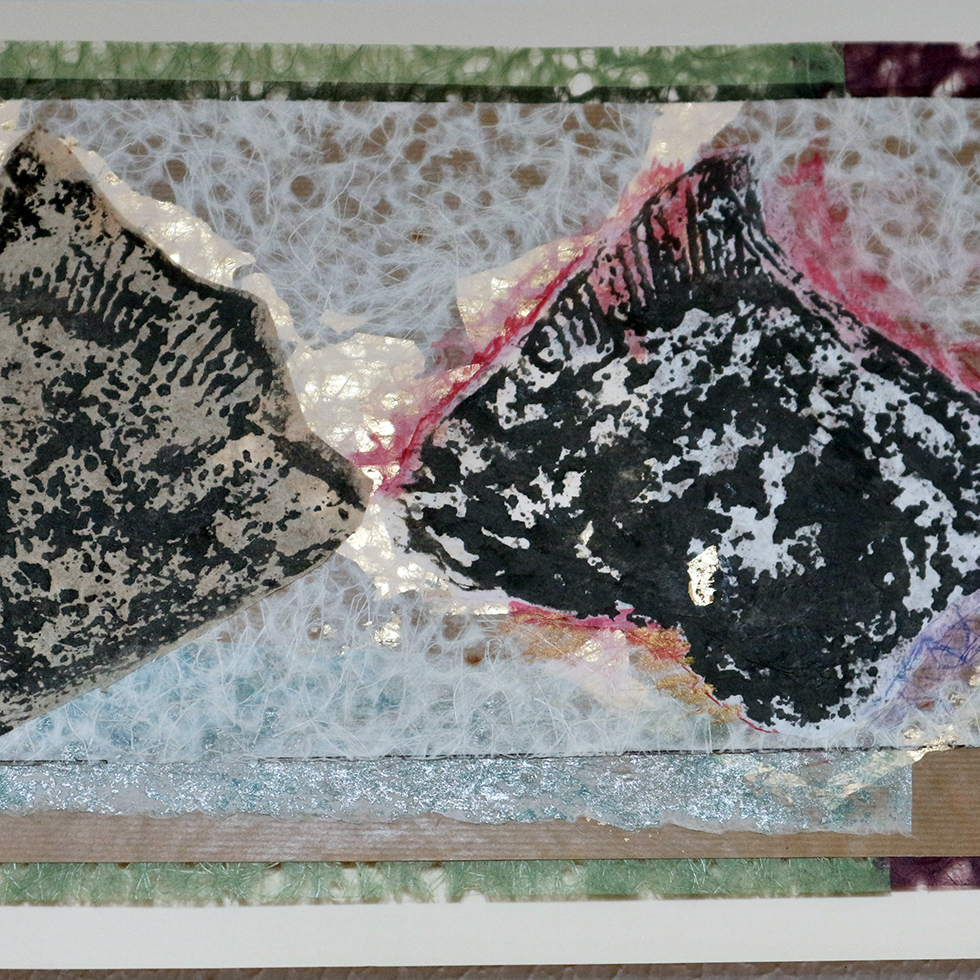 Inspirada por la antigua técnica japonesa Gyotaku. Obra original en papel, collage, tinta china y pintura. Copia única. 50 x 25 cm.